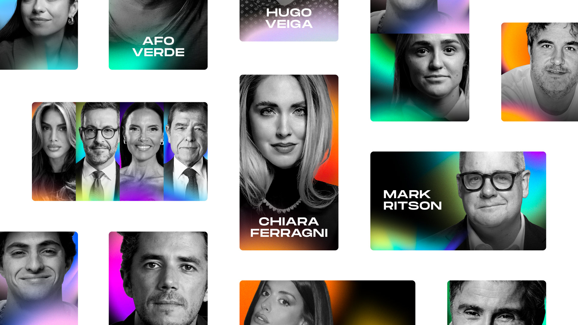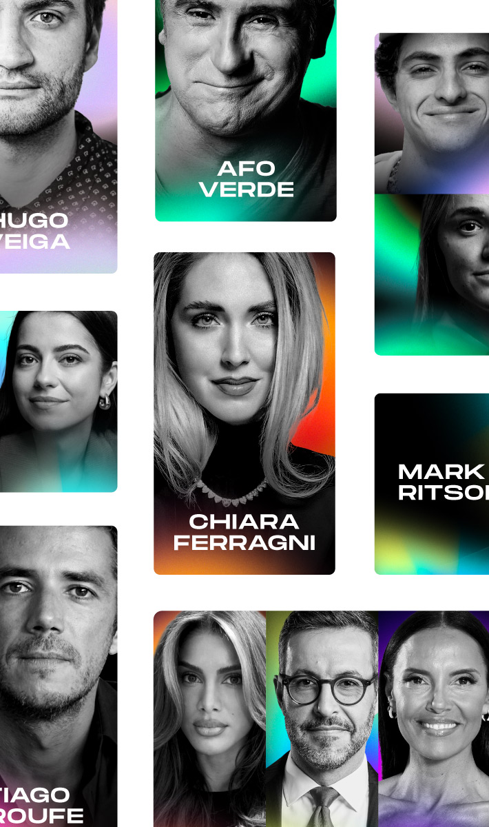 To define the visual direction, I explored how light, gradients, and movement could shape the emotional tone of the brand. These early studies helped establish a dynamic, fluid world that felt both digital and human. In parallel, I tested the system with real speakers and the mannequin figure to understand how color, texture, and photography could coexist within the same visual language.
